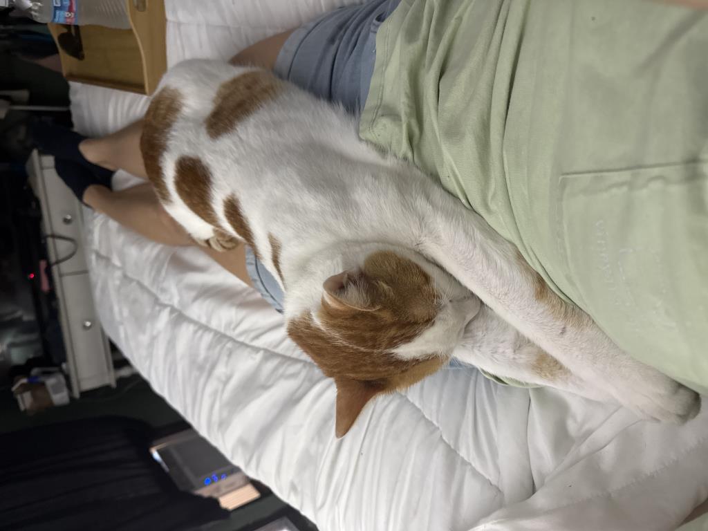Description: His name is bingo he’s primarily white white some orange on the top of his head and back and tail. Has a Marilyn Monroe orange kiss on his cheek